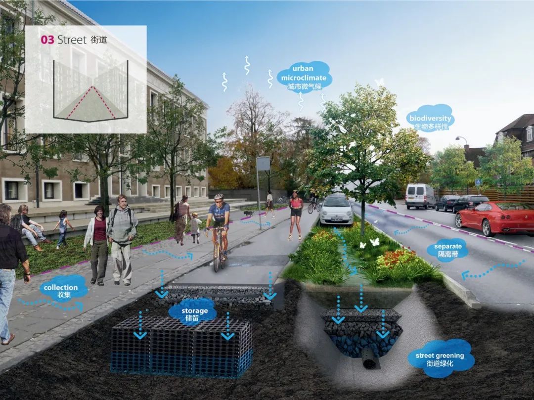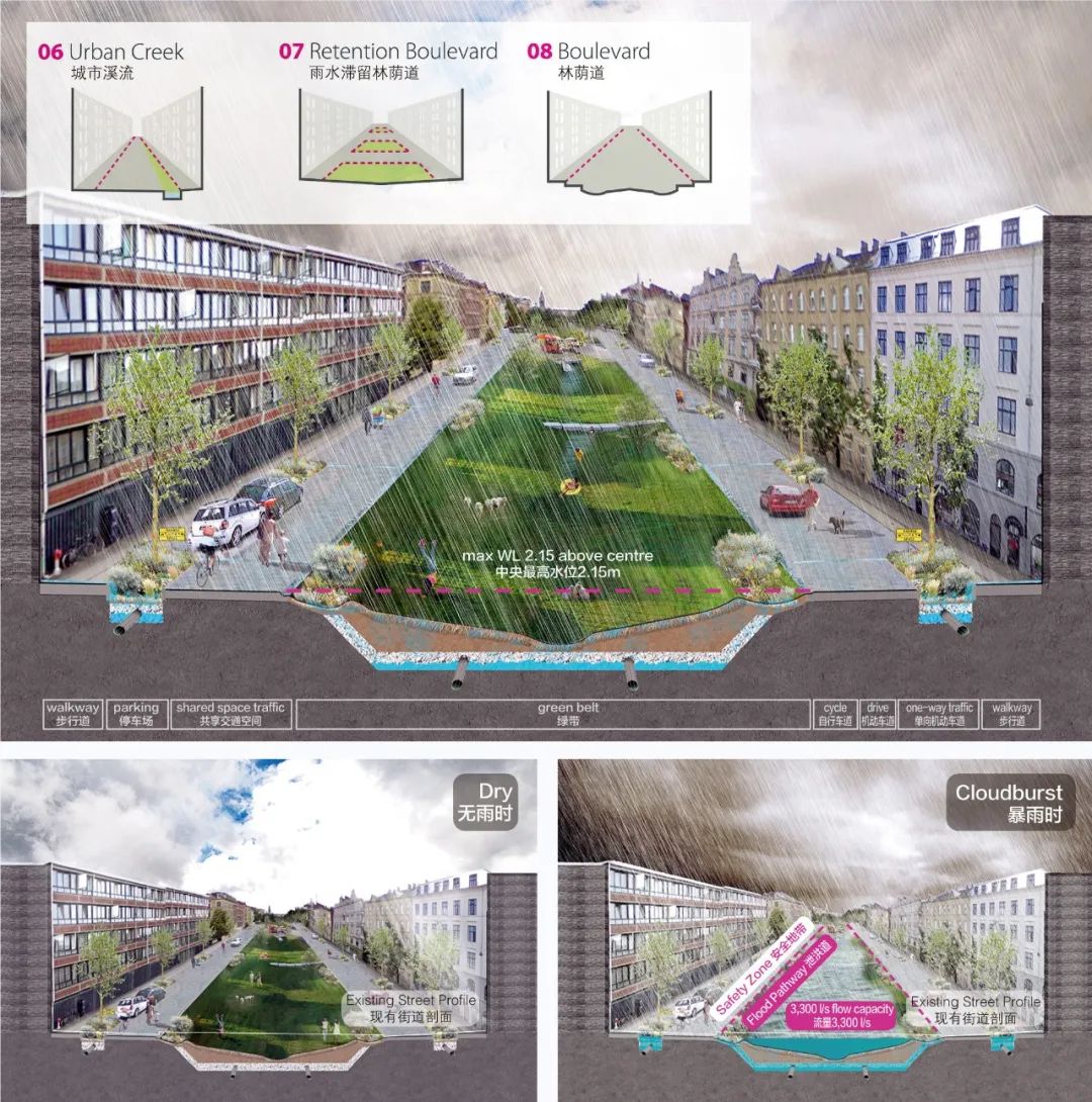 另一個用來緩解極端暴雨影響的具體策略是雨水滯留街道。這些街道通常是位于低洼、脆弱區(qū)域上游的次級道路,通過街道內(nèi)部的設(shè)計來創(chuàng)造巨大的蓄水空間。在不對交通產(chǎn)生重大妨礙的情況下,這些次級道路通??杀桓脑斐捎晁疁艚值馈Mㄟ^增加洼地、透水鋪裝等方式實現(xiàn)對雨水的滯留,并可以凈化雨水,從而實現(xiàn)對地下含水層的補給。