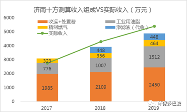 1)濟(jì)南十方項(xiàng)目中,以2019年度為例,剔除滲濾液代收代支的影響,政府的收運(yùn)+處置費(fèi)占比55%,粗油脂收入占比35%,二者合計(jì)貢獻(xiàn)濟(jì)南餐廚項(xiàng)目的90%收入來源。從歷年角度來看,粗油脂銷售收入正扮演越來越重要的地位。