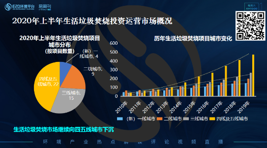 從項目分布城市看,2020年上半年的生活垃圾焚燒項目主要集中在三線、四線和五線城市。其中:一線城市無新增;新一線和二線城市分別中標4個和9個項目;三線城市中標15個項目,四線及五線城市中標22個項目,這與E20環(huán)境平臺執(zhí)行合伙人、E20研究院執(zhí)行院長、湖南大學兼職教授薛濤在“2019(第十三屆)固廢戰(zhàn)略論壇”上對生活垃圾增量市場的預(yù)測相吻合:一線城市基本瓜分完畢,生活垃圾焚燒市場逐漸向三四五線城市下沉。