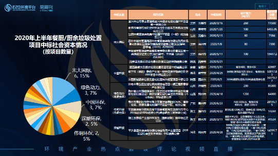 2020年上半年,近30家企業(yè)瓜分了近40個餐廚/廚余項目, 前5家企業(yè)光大國際、綠色動力、中國環(huán)保、深能環(huán)保、偉明環(huán)保拿了40%的項目數(shù)量,焚燒巨頭的進入,值得關(guān)注。詳細信息見右上表。