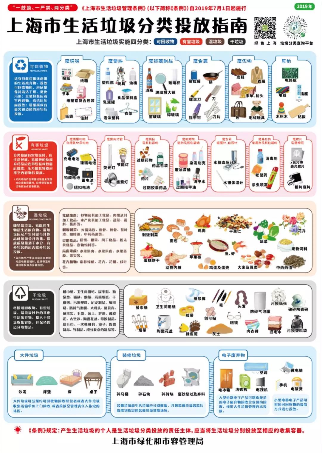 2019年,《上海市生活垃圾管理?xiàng)l例》頒布施行,全市1.3萬余個(gè)居村分類達(dá)標(biāo)率由2018年年底的15%提高到90%,單位分類達(dá)標(biāo)率達(dá)到87%,135個(gè)街鎮(zhèn)成功創(chuàng)建為“示范街鎮(zhèn)”,10個(gè)區(qū)創(chuàng)建成為“示范區(qū)”,下發(fā)首批71個(gè)垃圾分類示范街鎮(zhèn)專項(xiàng)補(bǔ)貼??苫厥瘴锘厥樟?049噸/日、環(huán)比增長(zhǎng)431.8%,有害垃圾分出量0.6噸/日、環(huán)比增長(zhǎng)504.1%,濕垃圾分出量7453噸/日、環(huán)比增長(zhǎng)88.8%,干垃圾處置量17731噸/日、環(huán)比下降17.5%。完成2.1萬余個(gè)分類投放點(diǎn)規(guī)范化改造,完成4萬余只道路廢物箱標(biāo)識(shí)更新,配置及涂裝237輛可回收物回收車、87輛有害垃圾車、1461輛濕垃圾車和3079輛干垃圾車,建成可回收物回收服務(wù)點(diǎn)1.5萬個(gè)、中轉(zhuǎn)站201個(gè)、集散場(chǎng)10個(gè),餐廚廢棄油脂收運(yùn)、處置閉環(huán)管理落實(shí)到位。干垃圾焚燒和濕垃圾資源化利用總量從1.4萬噸/日提高到2.1萬噸/日,生活垃圾填埋比例從41.4%下降到20%。
