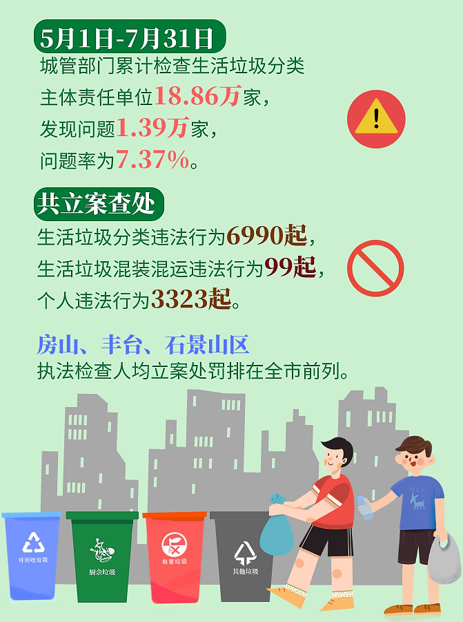 在此背景下,垃圾分類檢查執(zhí)法力度加強。5月1日至7月31日,執(zhí)法部門針對個人違法行為共查處3323起,查處個人違法行為的立案量占全部立案量的比例為58.20%。
