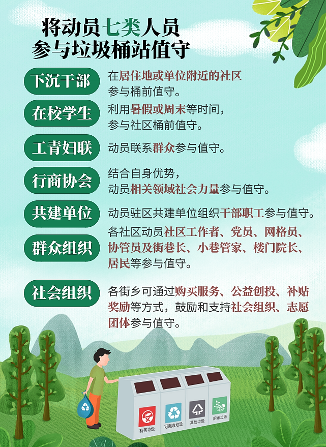 8月3日,北京市民政局副局長趙濟貴介紹,將動員七類人員下沉社區(qū)參加桶前值守,包括黨政機關(guān)和企事業(yè)單位干部、在校學(xué)生、工青婦聯(lián)團體、行商協(xié)會、街巷社區(qū)共建單位、群眾組織、社會組織。“社區(qū)首先利用好現(xiàn)有的垃圾分類指導(dǎo)員隊伍,加強管理和培訓(xùn),作為桶前值守的主力軍。同時,社區(qū)可組織樓門院長、網(wǎng)格員、黨員、熱心群眾等參與值守?!?/span>