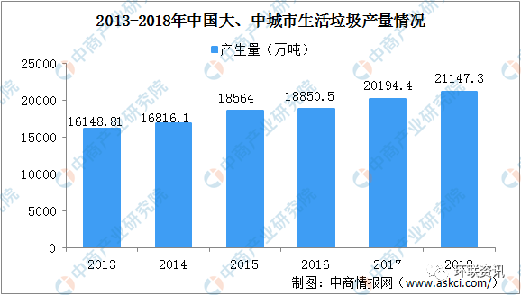我國是人口大國,也是垃圾產(chǎn)生大國,且隨著經(jīng)濟(jì)穩(wěn)步發(fā)展、民眾生活消費(fèi)水平、城鎮(zhèn)化率不斷提高,生活垃圾產(chǎn)生量持續(xù)走高,2018年,全國200個大、中城市生活垃圾產(chǎn)生量21147.3萬噸。