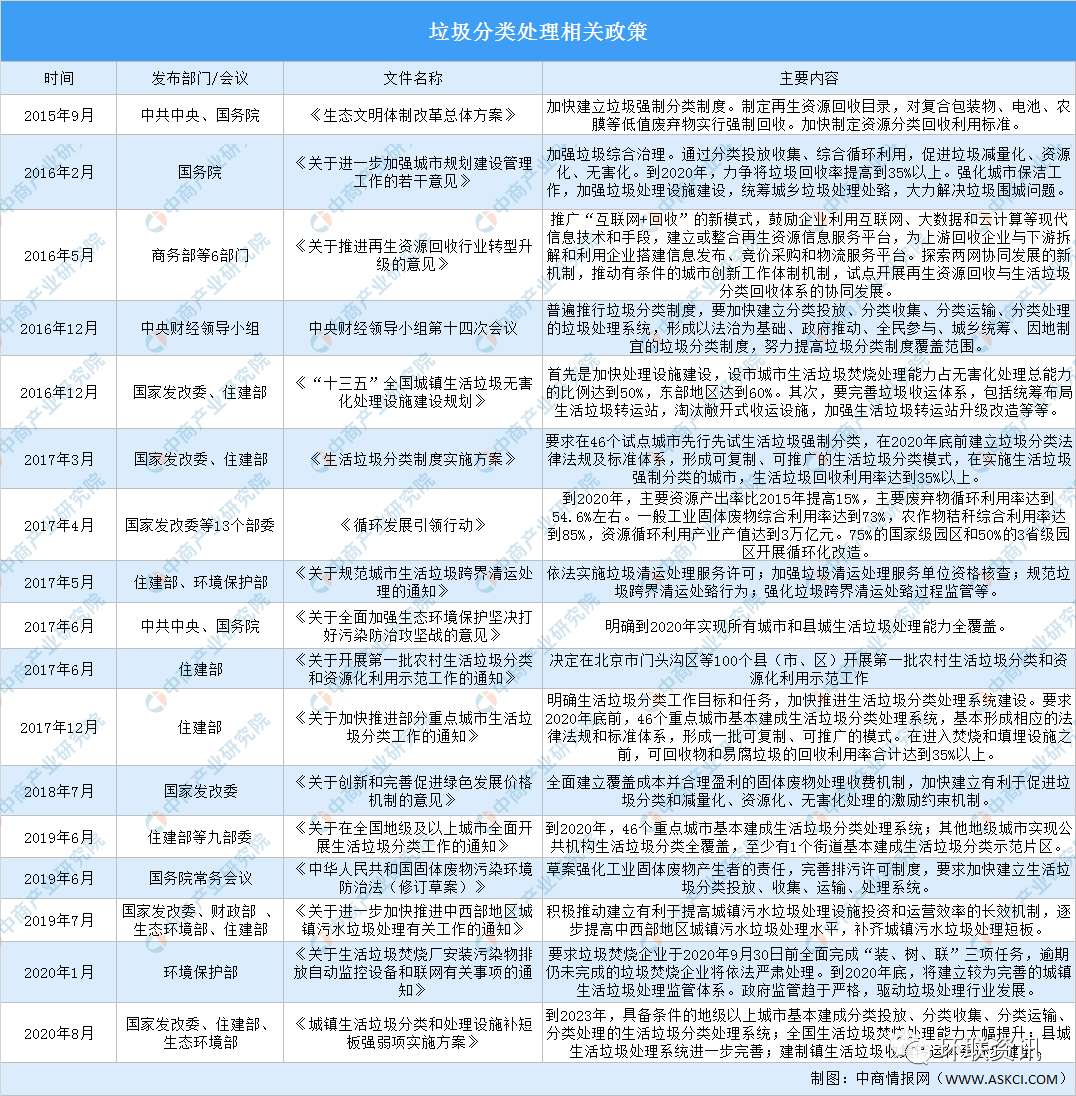 2020年1月,環(huán)境保護(hù)部印發(fā)《關(guān)于生活垃圾焚燒廠安裝污染物排放自動監(jiān)控設(shè)備和聯(lián)網(wǎng)有關(guān)事項(xiàng)的通知》,要求垃圾焚燒企業(yè)于2020年9月30日前全面完成“裝、樹、聯(lián)”三項(xiàng)任務(wù),逾期仍未完成的垃圾焚燒企業(yè)將依法嚴(yán)肅處理。到2020年底,將建立較為完善的城鎮(zhèn)生活垃圾處理監(jiān)管體系。政府監(jiān)管趨于嚴(yán)格,驅(qū)動垃圾處理行業(yè)發(fā)展。2020年8月,國家發(fā)展改革委、住房城鄉(xiāng)建設(shè)部、生態(tài)環(huán)境部聯(lián)合印發(fā)了《城鎮(zhèn)生活垃圾分類和處理設(shè)施補(bǔ)短板強(qiáng)弱項(xiàng)實(shí)施方案》,重點(diǎn)圍繞推進(jìn)垃圾分類投放、分類收集、分類運(yùn)輸、分類處理設(shè)施建設(shè)進(jìn)行部署?!冻擎?zhèn)生活垃圾分類和處理設(shè)施補(bǔ)短板強(qiáng)弱項(xiàng)實(shí)施方案》對于補(bǔ)齊生活垃圾分類處理能力缺口,推動形成與經(jīng)濟(jì)社會發(fā)展相適應(yīng)的生活垃圾分類和處理體系意義重大。