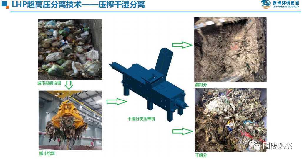 該項(xiàng)目設(shè)計(jì)規(guī)模是餐飲垃圾日處理400噸,廚余垃圾日處理600噸,糞污日處理1000噸,病死畜禽日處理40噸,合計(jì)設(shè)計(jì)規(guī)模2040噸,在近一年的實(shí)際運(yùn)營(yíng)期間,隨著廣州市垃圾分類和疫情的情況,產(chǎn)能結(jié)構(gòu)發(fā)生變化。主要特點(diǎn)是:1、垃圾分類不斷推進(jìn),廚余垃圾實(shí)際處理量增大;2、廣州舊城改造推進(jìn),糞污實(shí)際清運(yùn)和處理量比設(shè)計(jì)??;在實(shí)際運(yùn)營(yíng)中,其中餐飲垃圾目前處理量約500-600噸/天;廚余垃圾平均處理量約為1000噸/天,最高峰可達(dá)到近1200噸/日,占總處理量的一半以上。二、廣州項(xiàng)目的幾個(gè)亮點(diǎn)1. 朗坤環(huán)境集團(tuán)一直踐行如果對(duì)廚余垃圾去干榨凈,如何減少篩余物的含水率,提升篩余物的熱值?如何減少有機(jī)質(zhì)的流失?如何提升廚余垃圾的減量率?如何減少篩余物的外運(yùn)量?如何更好實(shí)現(xiàn)物質(zhì)的能源轉(zhuǎn)化?朗坤環(huán)境集團(tuán)研發(fā)的LHP超高壓分離技術(shù)真正對(duì)廚余垃圾做到了去干榨凈,通過(guò)在廣州項(xiàng)目一年多的應(yīng)用實(shí)踐,出渣易腐有機(jī)物比例達(dá)到了8-18%,預(yù)處理階段廚余垃圾整體減量達(dá)到了75-85%,僅有15-25%的篩余物外運(yùn)焚燒,實(shí)現(xiàn)了較高的減量率和有機(jī)質(zhì)提取率,工藝運(yùn)行穩(wěn)定、可靠,可以處理不破袋的廚余垃圾。