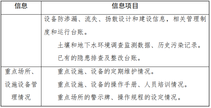 (一)確定排查范圍:通過(guò)資料收集、人員訪談,確定重點(diǎn)場(chǎng)所和重點(diǎn)設(shè)施設(shè)備,即可能或易發(fā)生有毒有害物質(zhì)滲漏、流失、揚(yáng)散的場(chǎng)所和設(shè)施設(shè)備。