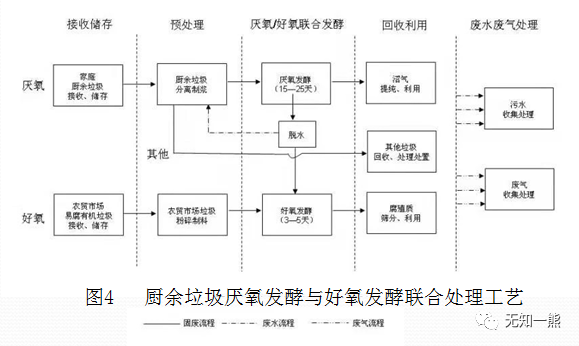被動方法是加強(qiáng)三廢處理。如對濕式發(fā)酵,沼液產(chǎn)量大,沼液產(chǎn)量可高達(dá)0.85倍以上廚余垃圾處理量,最好自配沼液處理設(shè)施,并加大中水回用以減少外加水量,且應(yīng)大力開發(fā)應(yīng)用回流和流體攪拌技術(shù)及裝備以減少沼液處理量和處理難度。濕式發(fā)酵轉(zhuǎn)換的沼渣產(chǎn)量也較大,應(yīng)妥善處置。廚余垃圾接收、預(yù)處理和沼液、沼渣處理等工序工段的臭氣控制也非常重要,應(yīng)強(qiáng)化相關(guān)設(shè)備設(shè)施的密封和加大相關(guān)車間的換氣次數(shù)。沼渣可經(jīng)脫水處理后焚燒處置,也可采用厭氧發(fā)酵與好氧發(fā)酵聯(lián)合工藝,與農(nóng)貿(mào)市場廚余垃圾一起堆肥,其工藝流程見圖4。