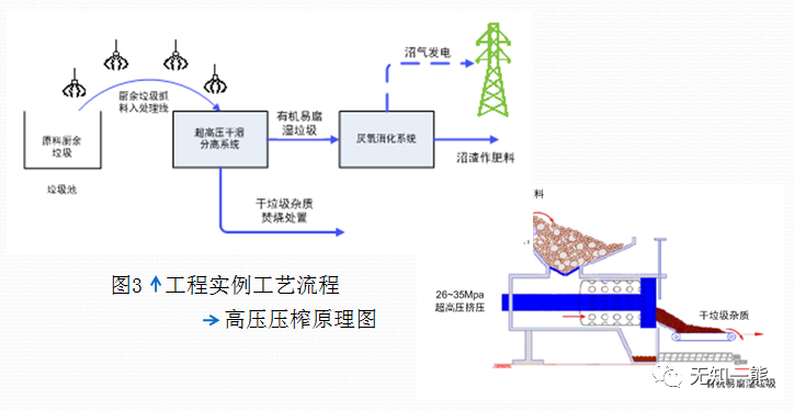 歐洲的高壓壓榨技術(shù)集破袋、破碎和擠壓制漿于一體,直接將廚余垃圾分離成干、濕組分(含水率分別為30%和70%左右),且允許廚余垃圾的雜質(zhì)含量高達(dá)30%,極大地縮短了預(yù)處理流程。干組分與其他垃圾混合,或直接焚燒回收熱能,或深加工成水泥窯用燃料;濕組分則通過厭氧發(fā)酵制取沼氣或堆肥。廣州福山生物質(zhì)廠已經(jīng)成功應(yīng)用,其工藝流程和高壓壓榨原理見圖3,建議推廣應(yīng)用。