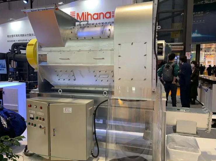 早在尚未亮相進(jìn)博會(huì)之前,今年首次參展的日本株式會(huì)社三華就吸引到不少媒體的注意,而注目的焦點(diǎn),正是他們?cè)诒敬芜M(jìn)博會(huì)上展示的一套廚余垃圾資源化處理系統(tǒng)。該系統(tǒng)能同時(shí)處理餐飲垃圾、廚余垃圾、商超過(guò)期食品等食品殘?jiān)?。同時(shí)由于系統(tǒng)前端的自動(dòng)破袋分揀機(jī)可將混雜在其中的塑料、金屬等雜質(zhì)自動(dòng)分揀出來(lái),經(jīng)過(guò)自動(dòng)破袋、破碎后,從干垃圾口排出。因而無(wú)需居民破袋即可直接投入垃圾桶。據(jù)悉,這一分揀機(jī)的分揀率目前在95% 以上,可滿足社區(qū)、學(xué)校、企事業(yè)單位,甚至是垃圾處理廠等場(chǎng)所的需求。垃圾處理量最多能超過(guò)100噸/天。