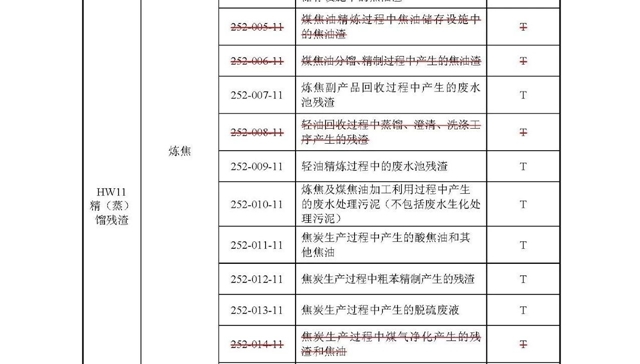 4.修改煤焦化相關(guān)危險廢物的規(guī)定。針對該類廢物重點從兩個方面進(jìn)行修改:一是重新梳理并明確了煤焦化過程產(chǎn)生的各類危險廢物及其工藝來源;二是根據(jù)不同煤焦油的利用途徑,在《危險廢物豁免管理清單》中增加當(dāng)煤焦油用于生產(chǎn)煤基氫化油、碳素材料、炭黑時,滿足一定條件利用過程可不按危險廢物管理的規(guī)定。