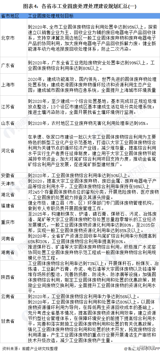 根據(jù)前瞻產(chǎn)業(yè)研究院匯總,截至2020年12月我國已經(jīng)有30多個省市地區(qū)就工業(yè)固廢處理的發(fā)展給出了相關(guān)的指導(dǎo)意見以及配套的措施,其中19個省份均已制定工業(yè)固廢處理綜合利用率階段性目標(biāo),并陸續(xù)出臺具體細(xì)化的地方性工業(yè)固廢處理政策扶持行業(yè)發(fā)展。