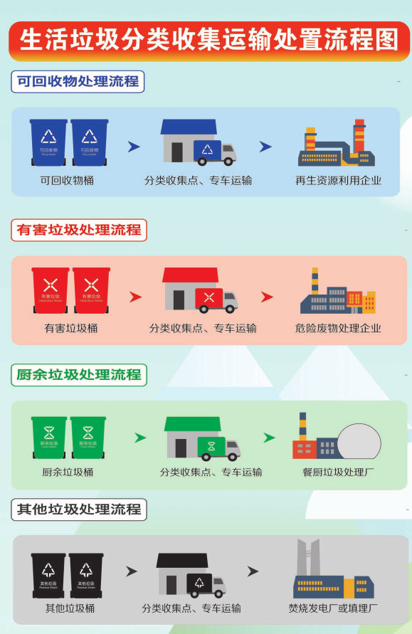 分類(lèi)投放、分類(lèi)收集、分類(lèi)運(yùn)輸、分類(lèi)處置。