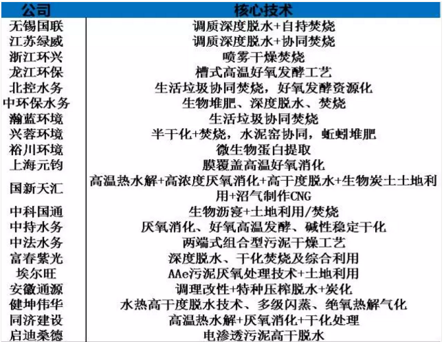 污泥行業(yè)中主要公司的處理核心技術(shù)統(tǒng)計(jì)表