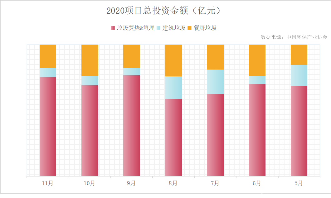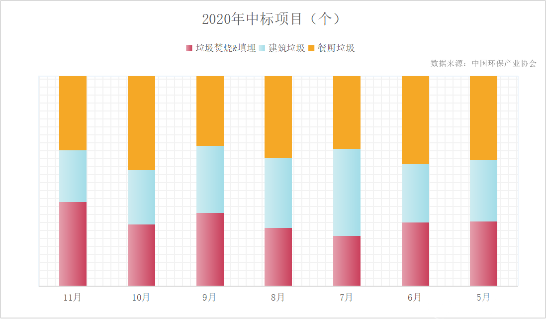 2020年前11個(gè)月,全國垃圾焚燒中標(biāo)項(xiàng)目共計(jì)311項(xiàng),總投資金額共計(jì)655.15億元;餐廚垃圾處理處置中標(biāo)項(xiàng)目共計(jì)361項(xiàng),總投資金額194.6億元;2020年5月到11月,全國建筑垃圾處理處置中標(biāo)項(xiàng)目共計(jì)213項(xiàng),總投資金額61.85億元。