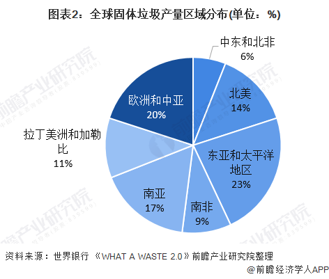 根據(jù)《WHAT A WASTE 2.0》公布的數(shù)據(jù)顯示,從全球固體垃圾產(chǎn)量區(qū)域分布來看,東亞和太平洋地區(qū)固體垃圾產(chǎn)生量最多,占全球的比重為23%,其次為歐洲和中亞地區(qū),其固體垃圾產(chǎn)生量占全球的比重為20%,南亞地區(qū)固體垃圾產(chǎn)生量占全球的比重為17%,北美地區(qū)固體垃圾產(chǎn)生量占全球的比重為14%。