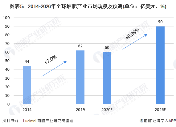 全球堆肥產(chǎn)業(yè)在農(nóng)業(yè),家庭園藝,園林綠化,園藝和建筑行業(yè)都有機(jī)遇。根據(jù)Lucintel公布的數(shù)據(jù)顯示,2019年全球堆肥產(chǎn)業(yè)市場規(guī)模為62億美元,由于COVID-19導(dǎo)致的全球經(jīng)濟(jì)衰退,預(yù)計全球堆肥產(chǎn)業(yè)市場規(guī)模將在2020年下降,2020年全球堆肥產(chǎn)業(yè)市場規(guī)模約為60億美元,然而,市場將在2021年見證復(fù)蘇,預(yù)計到2026年將達(dá)到90億美元,從2020年到2026年的復(fù)合年增長率為5%至7%。