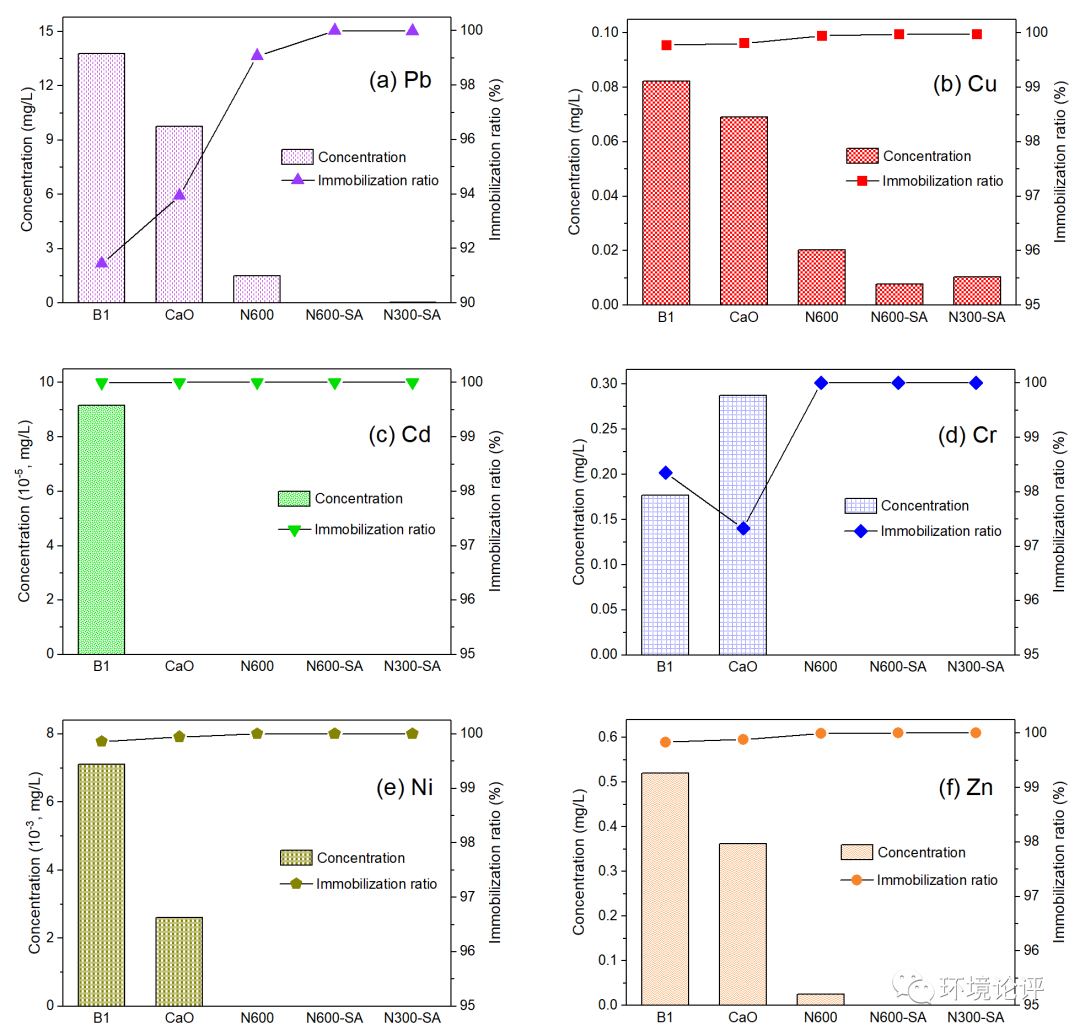圖|固化穩(wěn)定化前后各實(shí)驗(yàn)組六種重金屬的浸出濃度與固定率