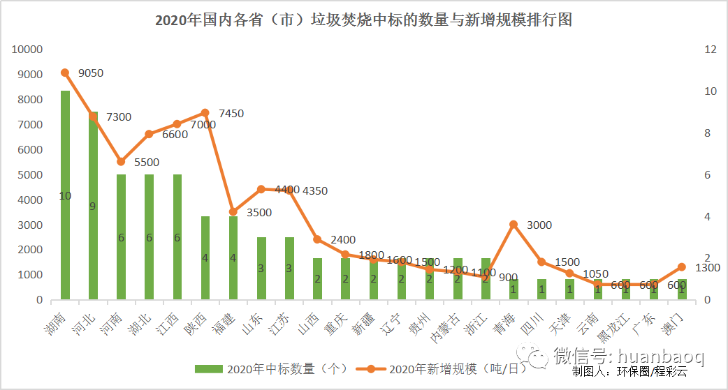 稍加留意就會(huì)發(fā)現(xiàn),相較于前兩年的大項(xiàng)目頻現(xiàn),各家企業(yè)中標(biāo)捷報(bào)頻傳,2020年類似的報(bào)道少了許多,全國釋放的垃圾焚燒項(xiàng)目罕見下滑,新增項(xiàng)目開始“降溫”。這一現(xiàn)象,筆者早在去年6月就注意到了,當(dāng)時(shí)還以為是受疫情的影響,但其實(shí)大家都想錯(cuò)了。據(jù)筆者長期跟蹤各省政府采購網(wǎng)統(tǒng)計(jì)得出,2020年1月-12月,國內(nèi)新中標(biāo)的垃圾焚燒發(fā)電項(xiàng)目累計(jì)72個(gè),相比2019年新中標(biāo)120個(gè)項(xiàng)目減少48個(gè),同比下滑了40%;新增日處理規(guī)模7.43萬噸/日,相比2019年近13萬噸/日的新增規(guī)模,同比減少了43%;總投資373億元,相比2019年總投資600億元也減少了227億元,降幅達(dá)到37.83%。(項(xiàng)目清單詳見文末)看得出來,2020年國內(nèi)釋放的垃圾焚燒項(xiàng)目,無論是中標(biāo)數(shù)量,還是日處理規(guī)模,亦或是總投資額,與2019年相比都有4-5成左右的下滑,下降的不是一點(diǎn)點(diǎn),而是幾乎“腰斬”。從月份來看,除了1月、4月、6月,2020年新增的日處理規(guī)模較2019年有所增長外,其余每個(gè)月份都有著不同程度的下滑,少則3-6千噸/日,多則上萬噸/日。其中,5月、7月、9月、10月四個(gè)月的下降幅度最大,均是萬噸/日級(jí)別以上的減少。(如圖一、圖二所示)圖一:2019年VS2020年,全國釋放的垃圾焚燒項(xiàng)目規(guī)模對(duì)比圖二:2020年國內(nèi)垃圾焚燒項(xiàng)目新增7.43萬噸/日,同比下降了43%02