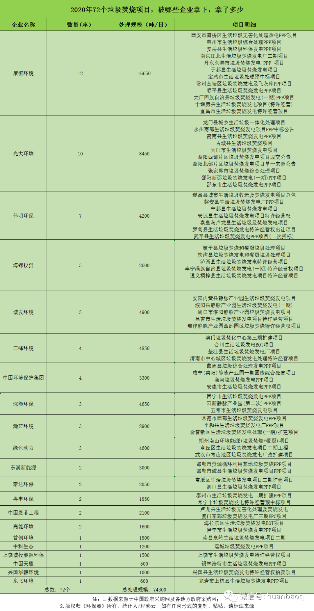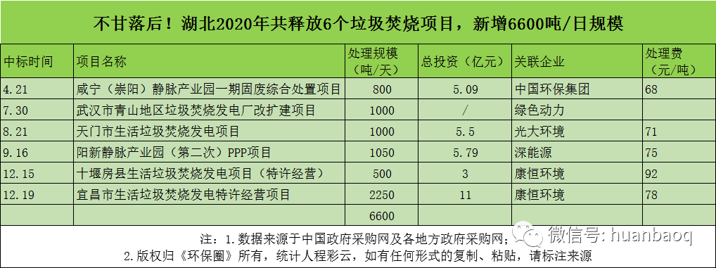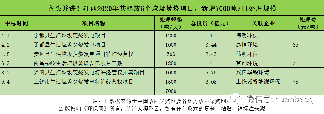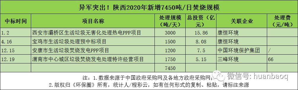 從項(xiàng)目分布的省份來看,2020年定標(biāo)的72個(gè)垃圾焚燒項(xiàng)目,分別分布在湖南、湖北、河南、河北、江西、陜西、福建、山東、江蘇等23個(gè)省市,其中湖南、湖北、江西、陜西在垃圾焚燒領(lǐng)域大放異彩,成為全國興建垃圾焚燒廠數(shù)量最多、新增規(guī)模最大的4個(gè)省份(如圖三、圖四所示)。圖三:2020年定標(biāo)的72個(gè)垃圾焚燒項(xiàng)目,分布的省市圖四:2020年國內(nèi)各?。ㄊ校├贌袠?biāo)的數(shù)量、新增規(guī)模排行但與此同時(shí),總體上看,2020年國內(nèi)絕大多數(shù)地區(qū)垃圾焚燒投資速度都是在放緩的,政府招投標(biāo)活動(dòng)不及2019年,下滑幅度最大的是“冀魯豫”三省。以河南為例,2019年河南省累計(jì)開標(biāo)26個(gè)垃圾焚燒項(xiàng)目,新增處理規(guī)模3.22萬噸/日;而到了2020年,則只有6個(gè)垃圾焚燒項(xiàng)目完成評(píng)標(biāo),新增處理規(guī)模5500噸/日,只有2019年的“零頭”。在河北,2019年全省新增21個(gè)垃圾焚燒項(xiàng)目,新增處理規(guī)模2.51萬噸/日;而到了2020年,這一數(shù)據(jù)則下滑到9個(gè)項(xiàng)目,新增處理規(guī)模7300噸/日,不足2019年的1/3。還有山東省,2019年山東全省共有11座垃圾焚燒項(xiàng)目完成定標(biāo)工作,新增處理規(guī)模近萬噸/日;而2020年,山東則只有3個(gè)垃圾焚燒項(xiàng)目開啟招標(biāo),新增規(guī)模不及2019年的一半。與以上這些省份相比,“兩湖兩西”--湖南、湖北、山西、陜西4省,則在其他省市投資速度放緩時(shí)“”異軍突起,不懼國補(bǔ)滑坡的負(fù)面效應(yīng),在2020年迎來了垃圾焚燒市場(chǎng)的大爆發(fā)。4省之中,湖南省“一馬當(dāng)先”。省內(nèi)永州、常德、益陽、張家界、常寧、邵陽等城市紛紛開啟招投標(biāo)工作,2020年共有10個(gè)垃圾焚燒項(xiàng)目完成定標(biāo),新增9050噸/日的處理規(guī)模,僅光大環(huán)境一家就斬獲其中7個(gè)項(xiàng)目,吃掉了70%的市場(chǎng)份額,成為湖南垃圾焚燒市場(chǎng)的“大贏家”(如圖五所示)。湖北也是“不甘落后”。雖然釋放速度不及湖南,但去年也是新增了6個(gè)垃圾焚燒大標(biāo),其中4個(gè)都是千噸級(jí)別的項(xiàng)目,宜昌市垃圾焚燒項(xiàng)目更是難得一見2250噸/日的大項(xiàng)目,吸引了光大環(huán)境、中國環(huán)境保護(hù)集團(tuán)、綠色動(dòng)力、深能、康恒環(huán)境等固廢大咖前來競(jìng)標(biāo)(如圖六所示)。圖六:2020年湖北省垃圾焚燒項(xiàng)目新增情況還有江西省。據(jù)《環(huán)保圈》跟蹤發(fā)現(xiàn),2019年江西垃圾焚燒新增規(guī)模共計(jì)3400噸/日,而2020年這一數(shù)據(jù)則攀升至7000噸/日,其中5個(gè)垃圾焚燒項(xiàng)目都是千噸級(jí)別以上(如圖七所示)。圖七:2020年江西省垃圾焚燒項(xiàng)目新增情況增長最明顯還屬陜西省。據(jù)《環(huán)保圈》進(jìn)一步跟蹤,2019年陜西境內(nèi)大多生活垃圾還靠填埋,垃圾焚燒普及率非常低,鄰避矛盾突出。而到了2020年,西安灞橋區(qū)、寶雞市、安康市、渭南中心城區(qū)等地紛紛開啟項(xiàng)目招投標(biāo)工作,雖然只有4個(gè)項(xiàng)目完成了定標(biāo)工作,但處理規(guī)模也一躍達(dá)到7500噸/日,僅次于湖南(如圖八所示)。圖八:2020年陜西省垃圾焚燒項(xiàng)目新增情況03