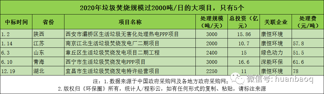 先是水務(wù)巨頭三峽集團(tuán)旗下子公司在湖北宜昌15天內(nèi)接連中標(biāo)2個(gè)垃圾焚燒發(fā)電訂單,高調(diào)“跨界”;緊接著半路出家、轉(zhuǎn)型不到3年的城發(fā)環(huán)境又要合并老牌環(huán)企啟迪環(huán)境,試圖打造黃河流域高質(zhì)量環(huán)保發(fā)展平臺(tái);然后“康恒僑銀”CP組合又從中國天楹、高能環(huán)境、偉明環(huán)保等一眾固廢名企中脫穎而出,中標(biāo)近5億元的湖北利川垃圾收集和焚燒發(fā)電一體化項(xiàng)目;最后,背靠浙江國資的浙能電力還擬以20.40元/股的價(jià)格,收購康恒環(huán)境最高5.9%的股權(quán)。“市場(chǎng)可以公開競(jìng)標(biāo)的項(xiàng)目一年比一年少,有些固廢名企的市場(chǎng)投資部都撤銷了,所以別再說什么垃圾焚燒項(xiàng)目‘跑馬圈地’了,都快沒‘地’可圈了?!?/span>某固廢企業(yè)市場(chǎng)投資部經(jīng)理表示。垃圾焚燒項(xiàng)目為啥少了?日處理規(guī)模數(shù)據(jù)為啥出現(xiàn)“斷崖式下滑”?市場(chǎng)真的沒“地”可圈了嗎?接下來,筆者將從項(xiàng)目分布的省份、日處理規(guī)模、總投資、中標(biāo)企業(yè)、處理費(fèi)等五大角度,通過大數(shù)據(jù)來解析一下2020國內(nèi)垃圾焚燒行業(yè)的四大特征,從而解釋之前高速增長的垃圾焚燒行業(yè)為何會(huì)在2020年迎來拐點(diǎn)?是“國補(bǔ)新政”惹得禍,還是市場(chǎng)真實(shí)需求在下滑?并提出“十四五”期間國內(nèi)垃圾焚燒市場(chǎng)發(fā)展的幾點(diǎn)建議,供大家參考。01