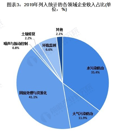 在我國(guó)環(huán)保產(chǎn)業(yè)企業(yè)中,水污染防治、環(huán)境監(jiān)測(cè)領(lǐng)域企業(yè)數(shù)量占比較高;水污染防治、固廢處置與資源化、大氣污染防治3個(gè)領(lǐng)域企業(yè)的營(yíng)業(yè)收入占比居前列,3個(gè)領(lǐng)域企業(yè)營(yíng)業(yè)收入之和占比高達(dá)88.4%。