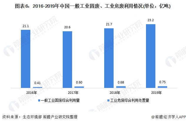 另從加工處置的角度來(lái)看,據(jù)生態(tài)環(huán)境部的統(tǒng)計(jì)數(shù)據(jù)顯示,2015-2019年,全國(guó)一般工業(yè)固廢和工業(yè)廢物的綜合利用量總體上升。2019年,全國(guó)一般工業(yè)固廢的綜合利用量為23.2億噸,工業(yè)危廢的綜合利用處置量為0.75億噸。