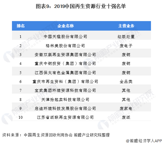 在企業(yè)競(jìng)爭(zhēng)格局方面,由于再生資源行業(yè)的業(yè)務(wù)范圍廣,行業(yè)的競(jìng)爭(zhēng)者數(shù)量較多,但根據(jù)廢棄物種類(lèi)的不同,各個(gè)企業(yè)的重點(diǎn)業(yè)務(wù)有所不同。2020年12月末,中國(guó)再生資源回收利用協(xié)會(huì)公布了《2019年中國(guó)再生資源行業(yè)50強(qiáng)榜單》,其中,TOP10企業(yè)的排名情況如下,廢鋼回收處利用市場(chǎng)的上榜企業(yè)較多: