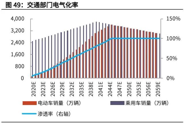 我們預(yù)計,乘用車銷量在 2040 年見頂,電動車的滲透率在 2045 年達到 100%, 則電動車的銷量將在 2045 年達到 3600 萬輛/年。假設(shè)單車售價保持下行趨勢, 在 2060 年達到 12 萬元/輛左右。則電動車領(lǐng)域累計將帶來 130 萬億人民幣的累 計新增投資。