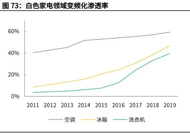 根據(jù)產(chǎn)業(yè)在線統(tǒng)計,2013 年變頻空調(diào)標(biāo)準(zhǔn)頒布實施,空調(diào)的變頻占有率提升超 過了 6 個百分點;2016 年 10 月份冰箱新標(biāo)準(zhǔn)實施,2017 年冰箱的變頻化率迅 速提高了 10%;洗衣機新標(biāo)準(zhǔn)在 2018 年 10 月推出,2019 年變頻洗衣機的市 占率較推出前大幅增加了 8 個百分點。