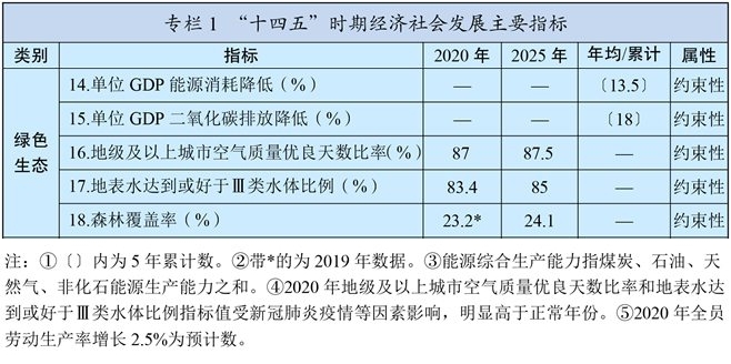 ——生態(tài)文明建設(shè)實現(xiàn)新進(jìn)步。國土空間開發(fā)保護格局得到優(yōu)化,生產(chǎn)生活方式綠色轉(zhuǎn)型成效顯著,能源資源配置更加合理、利用效率大幅提高,單位國內(nèi)生產(chǎn)總值能源消耗和二氧化碳排放分別降低13.5%、18%,主要污染物排放總量持續(xù)減少,森林覆蓋率提高到24.1%,生態(tài)環(huán)境持續(xù)改善,生態(tài)安全屏障更加牢固,城鄉(xiāng)人居環(huán)境明顯改善。