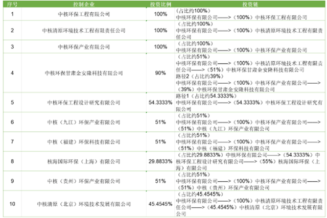 中國水網(wǎng)發(fā)現(xiàn),在中核環(huán)保所控制的27家企業(yè)中,環(huán)保企業(yè)共10家,包括中核清原環(huán)境技術(shù)工程有限責任公司,以及中核環(huán)保工程有限公司、中核環(huán)保產(chǎn)業(yè)有限公司、中核環(huán)保甘肅金安隆科技有限公司等,具體公司名稱、投資比例、投資鏈見下表。