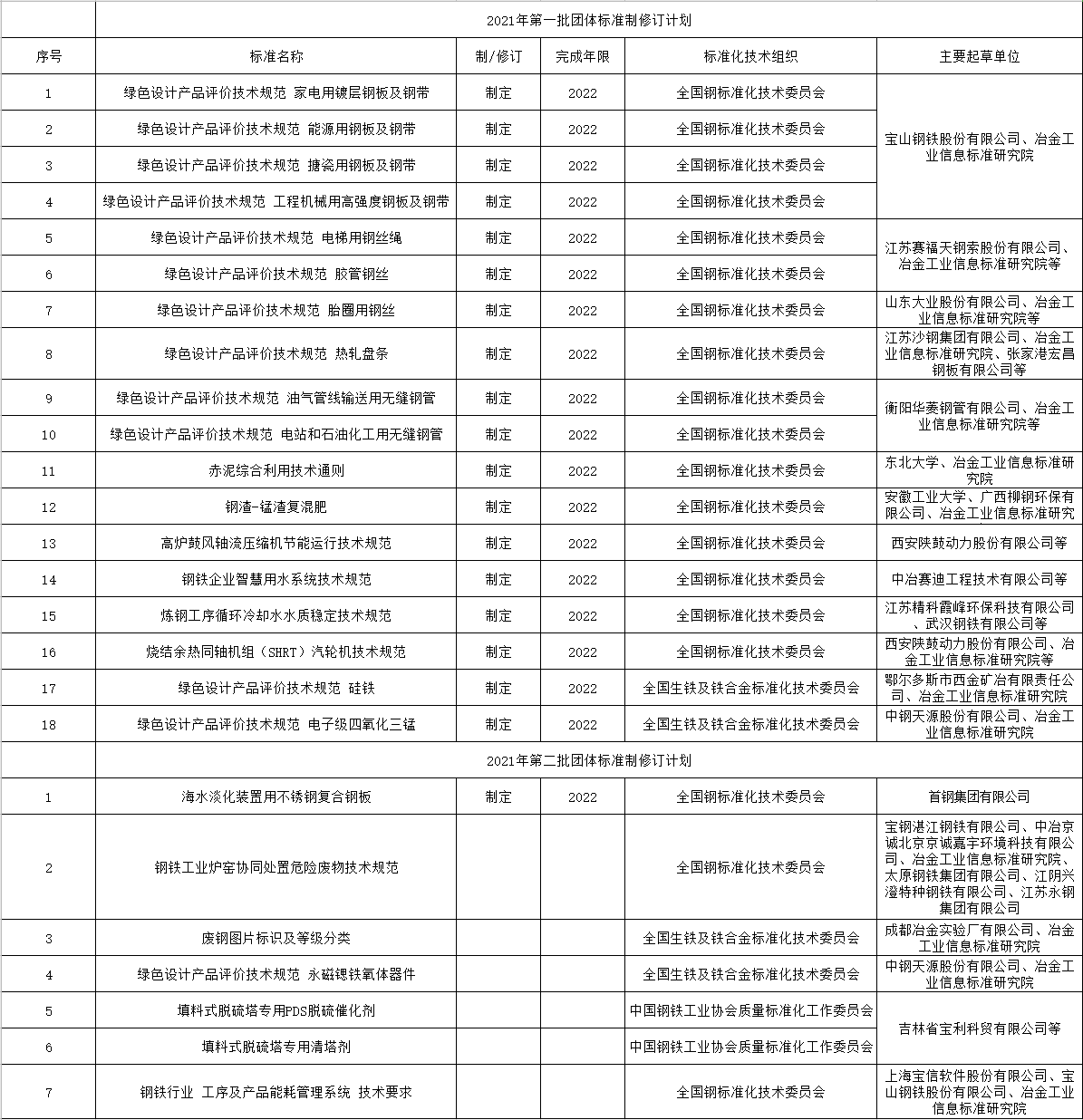 2021年以來,中國鋼鐵工業(yè)協(xié)會已經(jīng)相繼下達(dá)了兩批團(tuán)體標(biāo)準(zhǔn)制修訂計劃,包括: