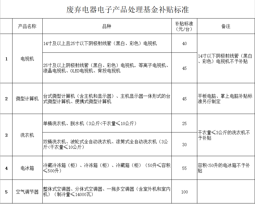 附件:廢棄電器電子產(chǎn)品處理基金補(bǔ)貼標(biāo)準(zhǔn)