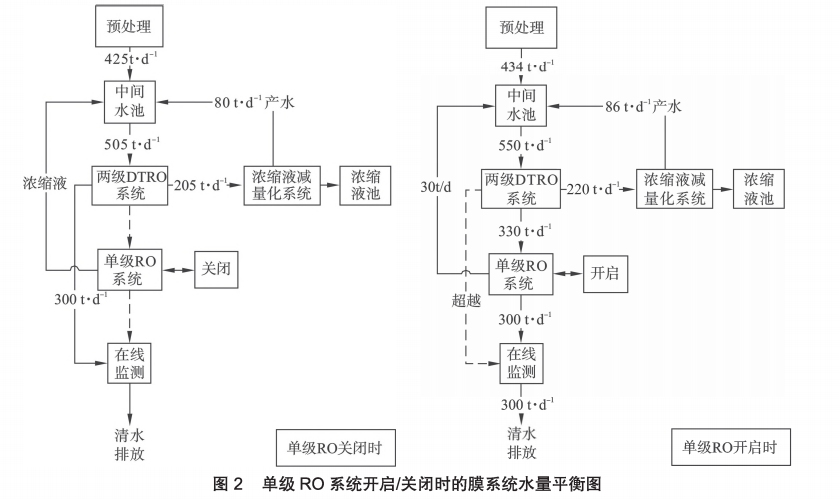 視兩級DTRO系統(tǒng)出水氨氮是否超標(biāo),選擇是否開啟單級RO系統(tǒng)。當(dāng)兩級DTRO系統(tǒng)出水氨氮靖,關(guān)閉RO系統(tǒng)此時系竝體回收率為70.59%;當(dāng)兩級DTRO出水氨氮值超標(biāo),開啟RO系統(tǒng),此 時系統(tǒng)整體回收率為69.12%。量平衡見圖2。