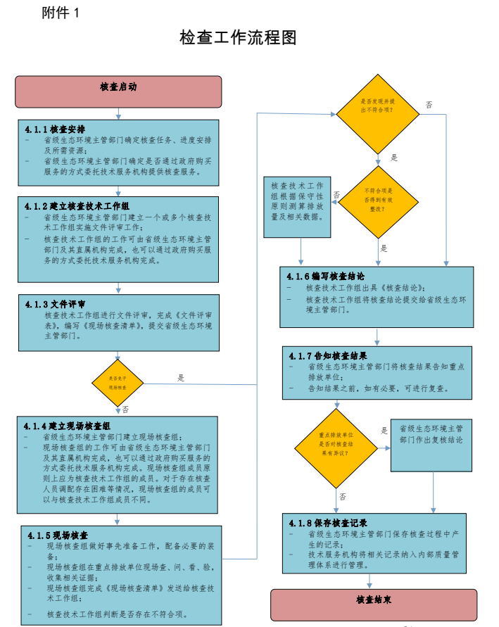 核查程序包括核查安排、建立核查技術工作組、文件評審、建立現(xiàn)場核查組、實施現(xiàn)場核查、出具《核查結論》、告知核查結果、存核查記錄等八個步驟,核查工作流程圖見附件1。