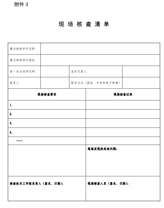 現(xiàn)場核查組應按照《現(xiàn)場核查清單》做好準備工作,明確核查任務重點、組內(nèi)人員分工、核查范圍和路線,準備核查所需要的裝備,如現(xiàn)場核查清單、記錄本、交通工具、通信器材、錄音錄像器材、現(xiàn)場采樣器材等。現(xiàn)場核查組應于現(xiàn)場核查前2個工作日通知重點排放單位做好準備。