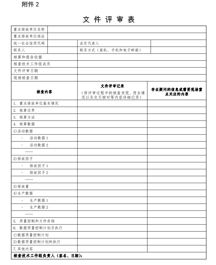 技術工作組應根據(jù)相應行業(yè)的溫室氣體排放核算方法與報告指南(以下簡稱核算指南)、相關技術規(guī)范,對重點排放單位提交的排放報告及數(shù)據(jù)質(zhì)量控制計劃等支撐材料進行文件評審,初步確認重點排放單位的溫室氣體排放量和相關信息的符合情況,識別現(xiàn)場核查重點,提出現(xiàn)場核查時間、需訪問的人員、需觀察的設施、設備或操作以及需查閱的支撐文件等現(xiàn)場核查要求,并按附件2和附件3的格式分別填寫完成《文件評審表》和《現(xiàn)場核查清單》提交省級生態(tài)環(huán)境主管部門。