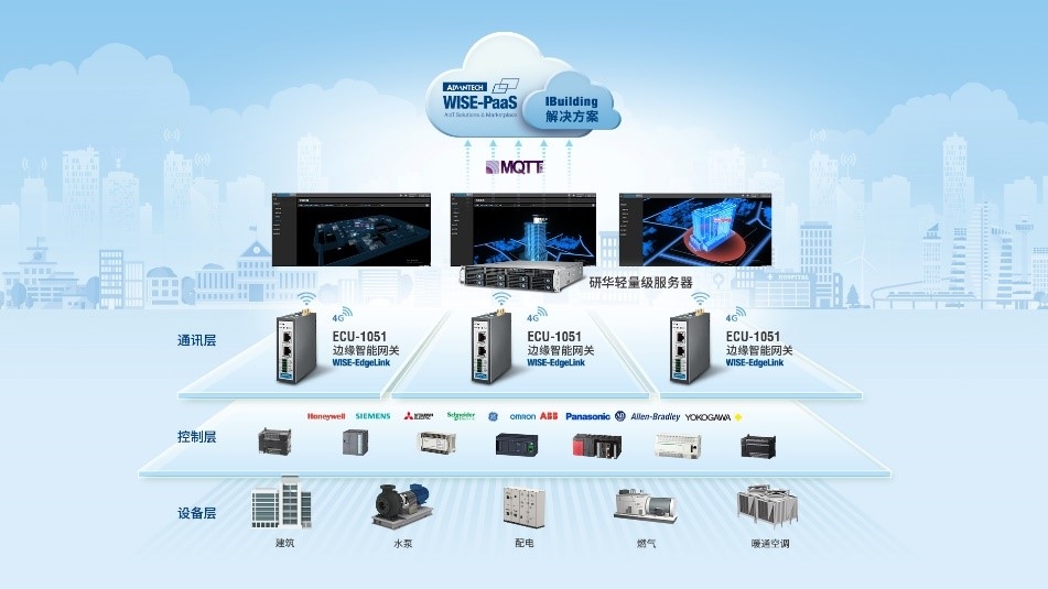 隨著能源的日益匱乏及國家碳中和碳達(dá)標(biāo)的相關(guān)政策引導(dǎo),各地政府要求區(qū)域內(nèi)企業(yè)在新建辦公地時,要實(shí)現(xiàn)建筑智能化。研華Ibuilding解決方案使用ECU-1051物聯(lián)網(wǎng)關(guān),通過Modbus/TCP協(xié)議對PLC設(shè)備進(jìn)行數(shù)據(jù)采集,并以4G的方式通過MQTT協(xié)議將數(shù)據(jù)傳至云平臺,藉由研華輕量化服務(wù)器建立私有化布署,實(shí)現(xiàn)對于建筑供配電系統(tǒng)、冷熱源系統(tǒng)、暖通系統(tǒng)、電梯、消防、水、門禁等系統(tǒng)的實(shí)時監(jiān)控與管理,實(shí)現(xiàn)遠(yuǎn)程運(yùn)維,減輕運(yùn)維成本,同時對于能耗設(shè)備的有效管理,減少的不必要的費(fèi)用能源損耗。