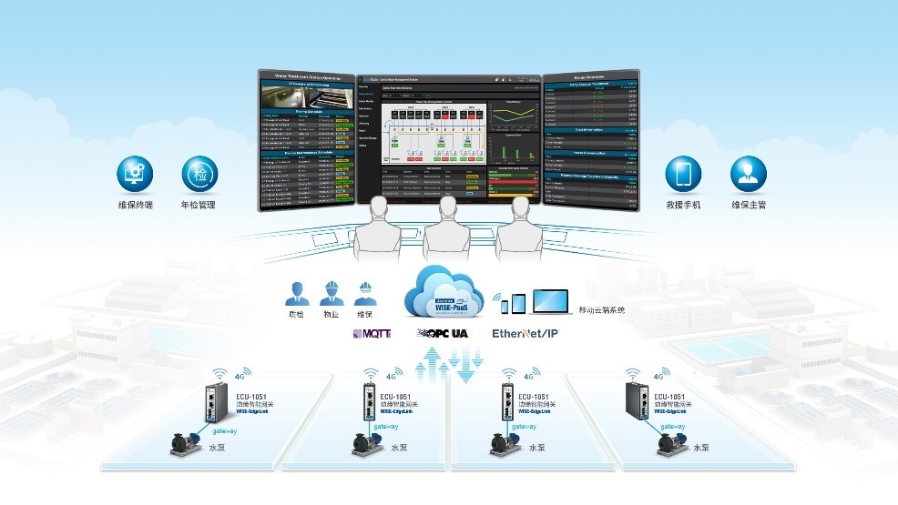 當(dāng)前很多的泵站監(jiān)控仍以人工方式進(jìn)行現(xiàn)場啟停,誤操作/延遲操作等情況時有發(fā)生,導(dǎo)致監(jiān)測不精準(zhǔn),監(jiān)管不到位,事故頻發(fā)。研華ECU-1051系列智能網(wǎng)關(guān)支持多種型號的PLC控制器的數(shù)據(jù)采集,并可以通過MQTT協(xié)議直接對接運(yùn)營商所選的云平臺Webaccess為BS架構(gòu)組態(tài)軟件,有效采集、展示、分析數(shù)據(jù)。通過遠(yuǎn)程控制方式對于現(xiàn)場設(shè)備進(jìn)行實(shí)時、準(zhǔn)確的監(jiān)測及故障預(yù)警,遠(yuǎn)程分級監(jiān)控管理設(shè)備狀況,實(shí)現(xiàn)設(shè)備、人、數(shù)據(jù)、流程的互聯(lián)互通,無縫對接企業(yè)ERP/CRM/手機(jī)APP系統(tǒng)遠(yuǎn)程資產(chǎn)管理設(shè)備位置信息建立產(chǎn)品知識庫,優(yōu)化產(chǎn)品性能及供應(yīng)鏈管理,提高產(chǎn)品競爭力。