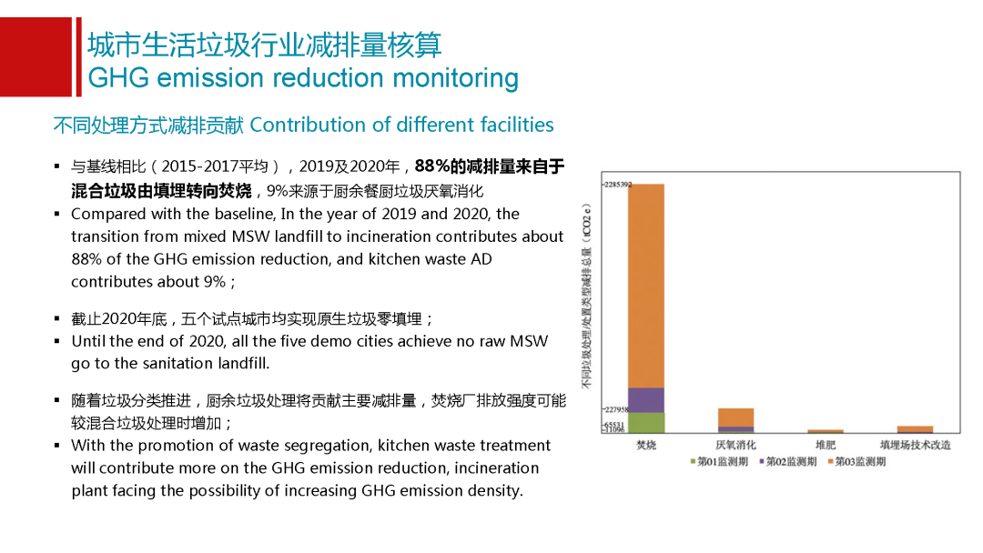 這里面也得到了試點(diǎn)城市特別主動(dòng)的支持,在西安他們新建的焚燒廠配備了設(shè)備,這給我們國(guó)家的焚燒企業(yè)將來(lái)在這個(gè)行業(yè)里面他們的氧化亞氮的排放情況怎么樣,能夠提供第一手的數(shù)據(jù)。在這個(gè)基礎(chǔ)模型的處置上,我們有了幾個(gè)基線選擇,選擇了2015到17年三年的平均值,作為我們整個(gè)項(xiàng)目的基線。在這之后,2019年和2020年我們兩年分別去這五個(gè)城市做了監(jiān)測(cè),可以看出有一些初步的結(jié)論。第一關(guān)于減排量和排放強(qiáng)度,這兩年從19年和20年,與基線相比,五個(gè)城市累計(jì)實(shí)現(xiàn)減排量260萬(wàn)噸二氧化碳當(dāng)量,這個(gè)相當(dāng)于是180萬(wàn)畝植樹(shù)造林,一年的碳匯地量,也是非常可觀的數(shù)據(jù)。除了排放總量,會(huì)有一個(gè)特別好的數(shù)值就是排放強(qiáng)度,垃圾管理行業(yè)排放強(qiáng)度是多少,從基線值到2020年,我們五個(gè)城市平均碳排放強(qiáng)度從0.8噸二氧化碳當(dāng)量每噸垃圾降到了0.5,能夠看出中國(guó)垃圾行業(yè)以五個(gè)試點(diǎn)城市為例,已經(jīng)實(shí)現(xiàn)向低碳化發(fā)展的轉(zhuǎn)型。碳排放強(qiáng)度的降低已經(jīng)達(dá)到了40%以上,能夠看到我們行業(yè)是在更清潔、更低碳,這個(gè)是一個(gè)特別有意義的數(shù)據(jù)。我們也分享給我們總部以及國(guó)際同事,他們非常認(rèn)可,能夠看到中國(guó)垃圾行業(yè)在向低碳方面轉(zhuǎn)型升級(jí)。
