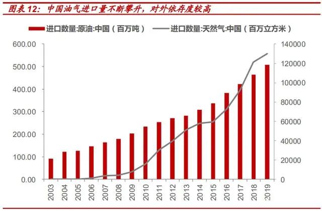 從進(jìn)口細(xì)分?jǐn)?shù)據(jù)看,石油、天然氣等能源進(jìn)口量占整體進(jìn)口量的13.28%, 僅次于芯片等關(guān)鍵技術(shù)部件,礦產(chǎn)占比達(dá)到 9%。作為我國制造業(yè)的“血 液”,近年來,我國這兩項進(jìn)口的需求和對外依存度呈增加趨勢:2019 年,原油進(jìn)口達(dá) 5.1 億噸,增長 9.5%,對外依存度升至 72.45%,天然 氣進(jìn)口 9656 萬噸,增長 6.9%,對外依存度為 44%,油氣主要進(jìn)口國為 美俄、沙特等中東國家。根據(jù) IRENA 數(shù)據(jù),2019 年中國陸上風(fēng)電、太 陽能光伏、水電累計裝機規(guī)模分別占全球總量的 34%、35%、27%,碳 中和目標(biāo)路徑下,新舊能源結(jié)構(gòu)的轉(zhuǎn)變有助于提升中國國內(nèi)大循環(huán)下的 供給側(cè)的上游資源可控。