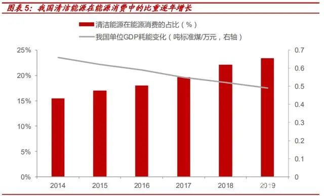 實際上,伴隨政府對新能源領(lǐng)域的研究與使用的倡導(dǎo),2014-2019 年我 國單位 GDP 能耗已經(jīng)出現(xiàn)連續(xù)下滑,我國能源利用效率逐年增長。2019 年,我國每萬元 GDP 消費 0.49 噸標(biāo)準(zhǔn)煤,較 2018 年下降 4.84%。清 潔能源在能源消費中的比重就增長至 23.4%,但傳統(tǒng)的煤炭、石油占比 分別為 57.7%、18.9%,仍是我國主要的能源消耗來源。