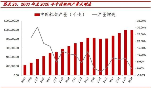 我國鋼鐵鐵行業(yè)碳排放量占全國碳排放總量的 15%,是碳排放最高的制造業(yè)。粗鋼作為傳統(tǒng)鋼煉產(chǎn)能主體,在我國產(chǎn)量居高不下,我國粗鋼產(chǎn) 量從 1949 年的 15.6 萬噸,僅占全球產(chǎn)量的 0.1%,而 2020 年我國粗鋼 產(chǎn)量為 10.53 億噸,占比全球 53.3%。從增幅方面來開17 年來我國粗 鋼產(chǎn)量增速已經(jīng)開始走低,為后期粗鋼等低質(zhì)高碳排鋼材的退出作出鋪 墊,但短期粗鋼等仍是我國鋼鐵行業(yè)產(chǎn)能主流。