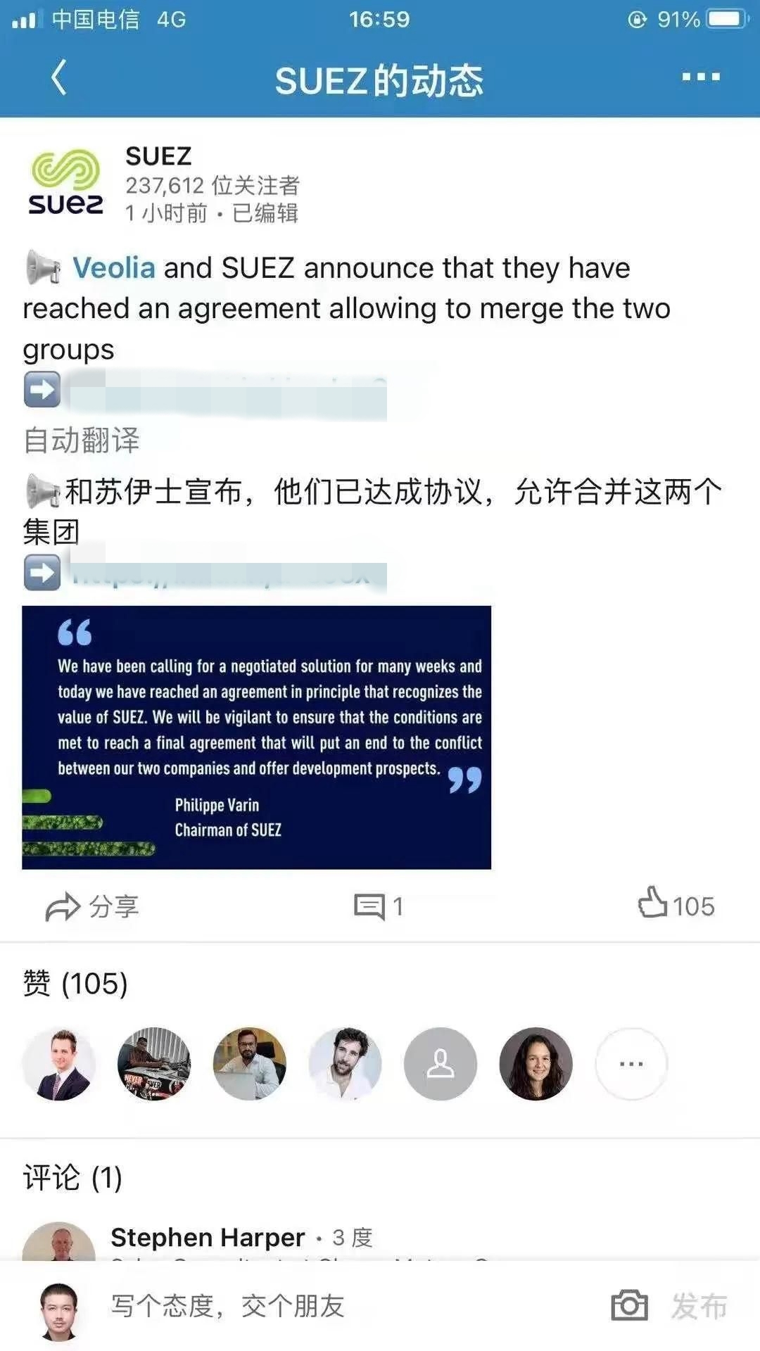 該協(xié)議將從工業(yè)和社會的角度出發(fā),創(chuàng)建新的蘇伊士公司,該公司的資產(chǎn)由一個連貫的,可持續(xù)的部門組成,并具有真正的增長潛力,營業(yè)額約為70億歐元;通過蘇伊士收購要約,威立雅創(chuàng)造了生態(tài)轉(zhuǎn)型世界冠軍的計劃的實施,該交易的銷售額約為370億歐元,其中仍將保留威立雅確定的所有戰(zhàn)略資產(chǎn)等。