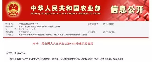 8月16日,農(nóng)業(yè)部公開了對十二屆全國人大五次會議第5429號建議的答復,對劉正軍、李祖?zhèn)ゴ硖岢龅摹瓣P于盡快細化各類有機廢棄物農(nóng)用標準,促進有機廢棄物資源化利用的建議”做了三方面詳細反饋。