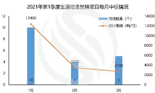據(jù)E標(biāo)通統(tǒng)計,2021年第1季度共計釋放19個生活垃圾焚燒項目,新增日處理能力1.86萬噸/日。其中,1月份釋放生活垃圾焚燒項目最多(10個),新增日處理能力1.24萬噸/日。