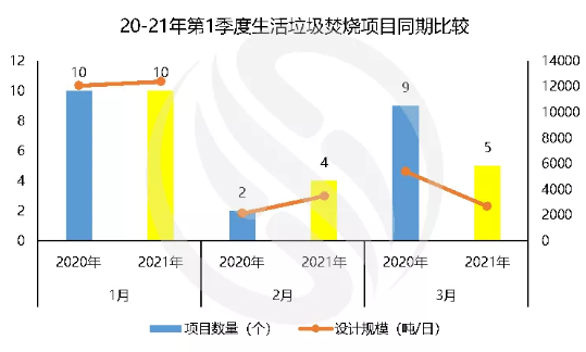 與2020年第1季度進行同期比較,從項目數(shù)量上看,2020年第1季度共計中標(biāo)21個生活垃圾焚燒項目,2021年第1季度共計成交19個焚燒項目,同比減少2個焚燒項目。從新增日處理規(guī)???,2020年第1季度新增焚燒日處理規(guī)模1.96萬噸/日,21年則下降至1.86萬噸/日,同比下降1000噸/日。結(jié)合各省市陸續(xù)發(fā)布的生活垃圾焚燒中長期規(guī)劃及國補政策的調(diào)整等因素,生活垃圾焚燒項目的增速放緩或成定勢。2020-2021年每月同期比較情況見上圖。