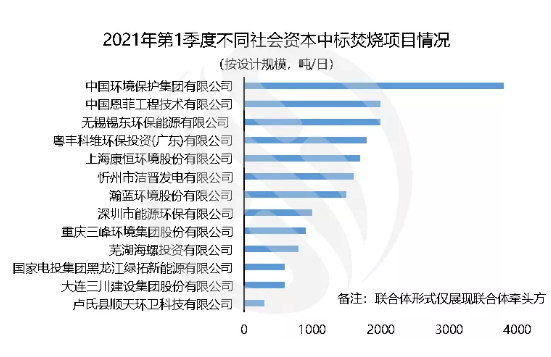(2)2021年第1季度共計釋放19個生活垃圾焚燒項目,新增日處理能力1.86萬噸/日;中部地區(qū)成交生活垃圾焚燒項目最多,共計8個,新增日處理能力9100噸/日;從中標(biāo)社會資本方看,1季度新增規(guī)模最多的社會資本為中國環(huán)保,連續(xù)拿下陜西安康、江西龍南和河南封丘3個項目,焚燒日處理能力新增3800噸/日。