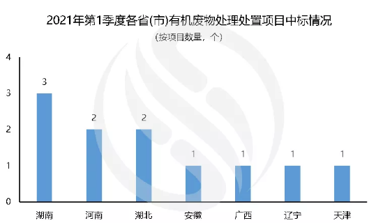 (3)2021年第1季度共計釋放有機廢棄物處理處置項目11個項目,主要分布在湖南、河南、湖北、安徽、廣西、遼寧和天津等7個省市,中部地區(qū)釋放最多,共計釋放8個項目。